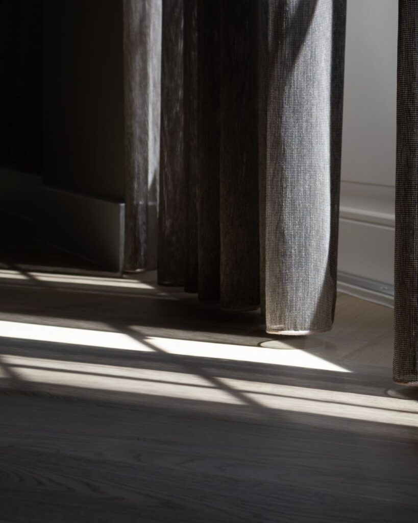 DeĀ raambekledingĀ versterkt dat gevoel van zachtheid en licht. In de keuken zijn luchtige inbetweens geplaatst die het daglicht subtiel filteren en zorgen voor een elegante, uitnodigende sfeer. In de woonkamer brengen deĀ vouwgordijnen extra warmte en een gevoel van geborgenheid, perfect afgestemd op de rustige kleuren van het interieur.