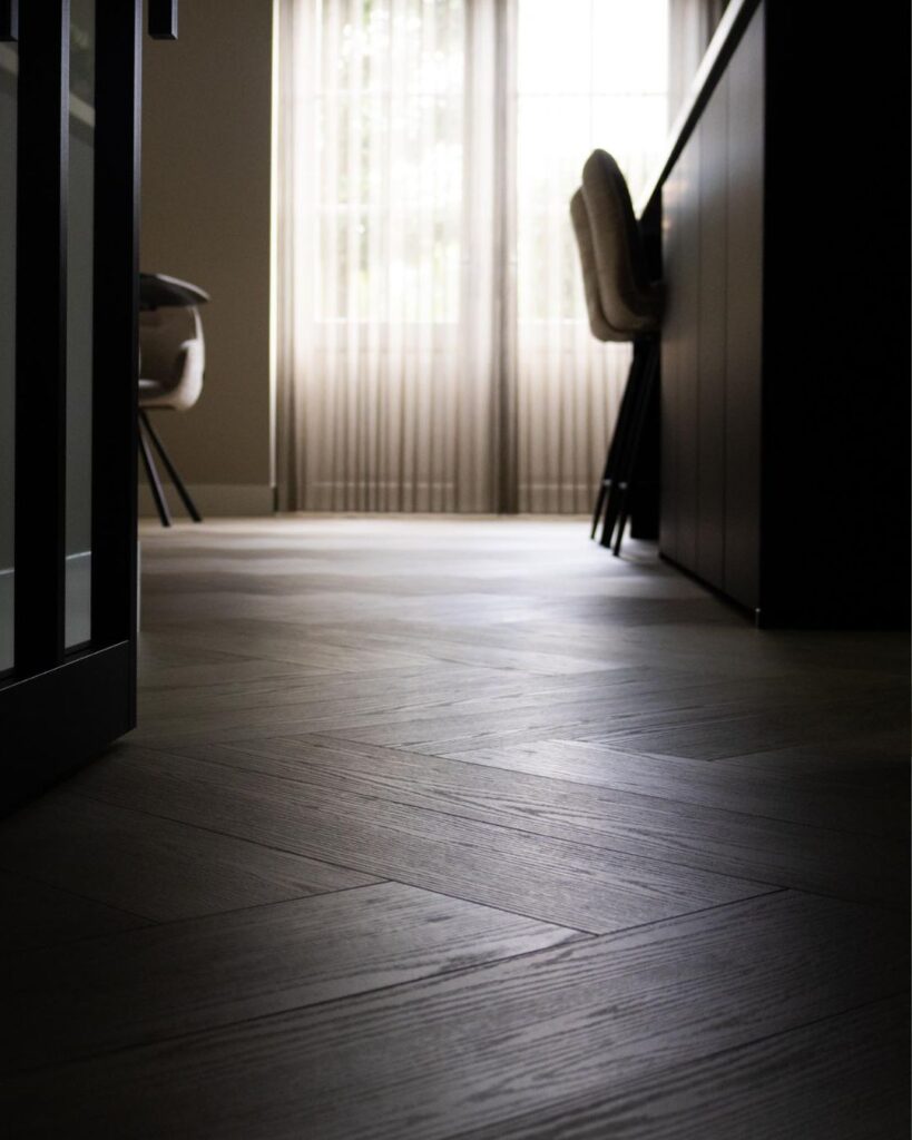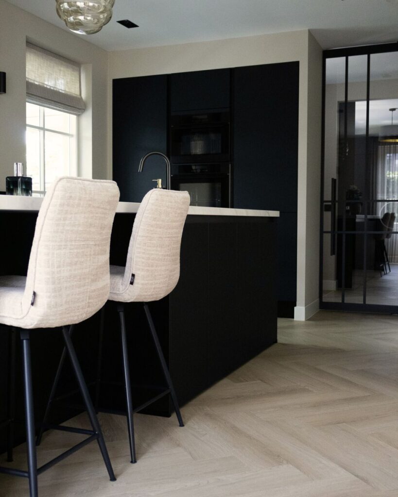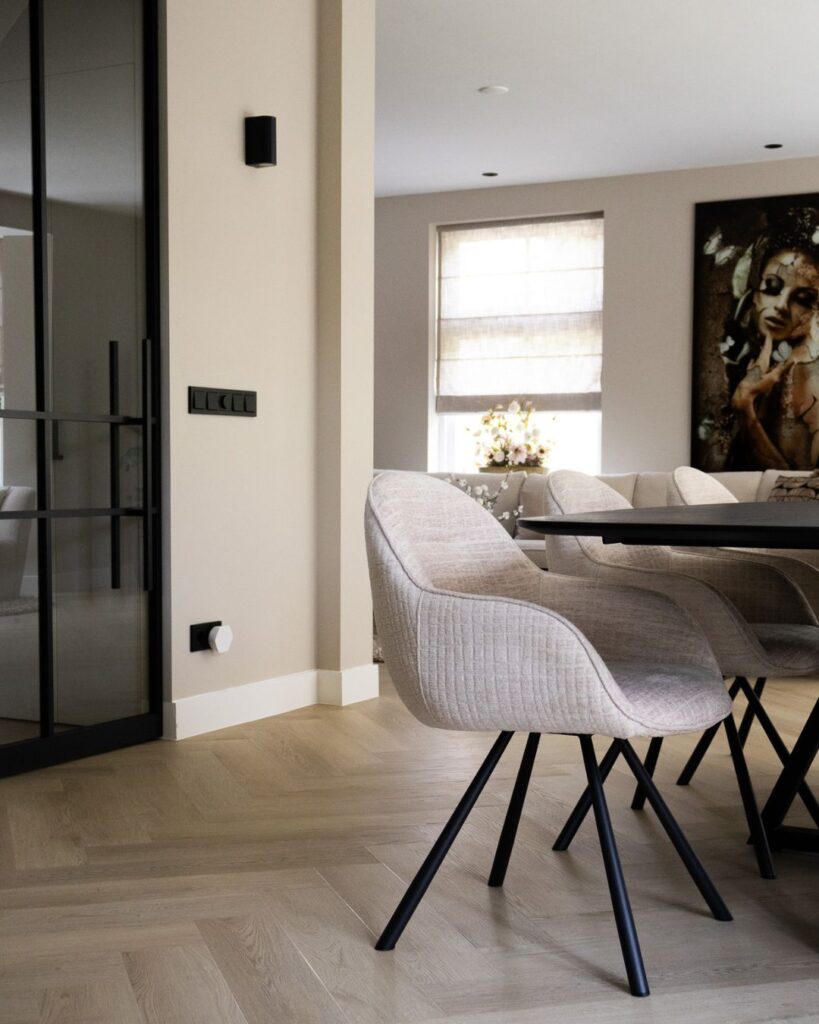 De basis van het interieur wordt gevormd door een PVC visgraatvloer met een natuurlijke, rustige uitstraling. Deze vloer brengt warmte in de ruimte, maar behoudt tegelijk de moderne en open sfeer van de woning. Door de ondervloer zorgvuldig te egaliseren, is een strak eindresultaat bereikt waarin iedere plank naadloos opgaat in het geheel.